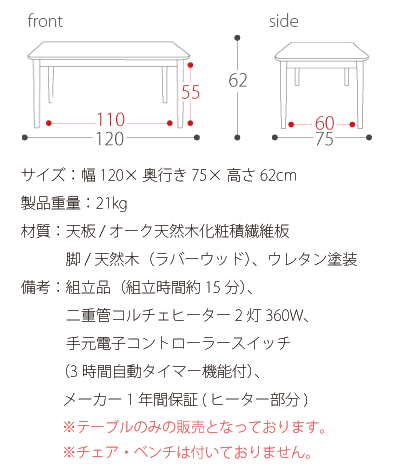 【チェア】 サイズ:幅120×奥行き75×高さ62cm 製品重量:21kg 材質:天板/ オーク天然木化粧積繊維板脚/天然木(ラバーウッド)、ウレタン塗装 備考:組立品(組立時間約15分)二重管コルチェヒーター2灯360W、手元電子コントローラースイッチ(3時間自動タイマー機能付)メーカー1年間保証(ヒーター部分)※テーブルのみの販売となっております。