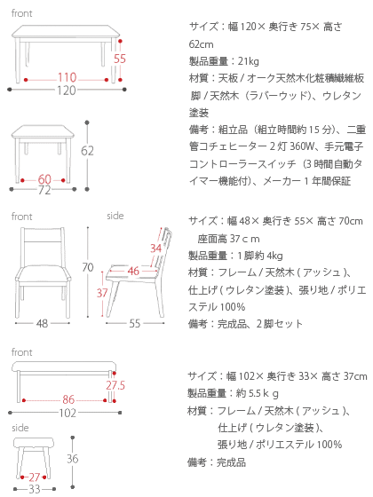 【チェア】 サイズ(テーブル):幅120×奥行き75×高さ62cm 製品重量:21kg 材質:天板/ オーク天然木化粧積繊維板脚/天然木(ラバーウッド)、ウレタン塗装 備考:組立品(組立時間約15分)二重管コルチェヒーター2灯360W、手元電子コントローラースイッチ(3時間自動タイマー機能付)メーカー1年間保証 サイズ(チェア):幅48×奥行き55×高さ70cm 座面高37cm 製品重量:1脚約4kg 材質:フレーム/天然木(アッシュ)、仕上げ(ウレタン塗装)張り地/ポリエステル100% 備考:完成品 サイズ(ベンチ):幅102×奥行き33×高さ37cm 製品重量:約5.5kg 材質:フレーム/天然木(アッシュ)、仕上げ(ウレタン塗装)張り地/ポリエステル100% 備考:完成品 カテゴリー:ダイニングセット/4点セット/ダイニング4点セット/ダイニングテーブル/ダイニングチェア/ダイニングテーブル/ベンチ/こたつテーブル/ダイニング/テーブル/ふとんレスこたつコルチェヒーター/速暖性/シンプル/モダン/木製ダイニング/ウッド/カントリー/北欧/天然木/寒さ対策