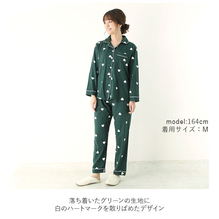 ・落ち着いたグリーンの生地に白のハートマークを散りばめたシンプルデザイン。