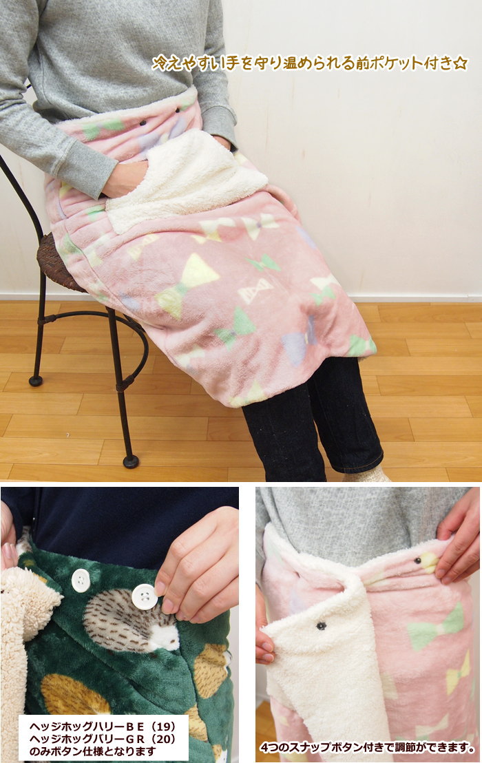 洋服の上からサッと巻いて下半身を温めてくれるので、家事や オフィス、室内での防寒や節電に最適! 裏面ボアがとってもあったかい♪