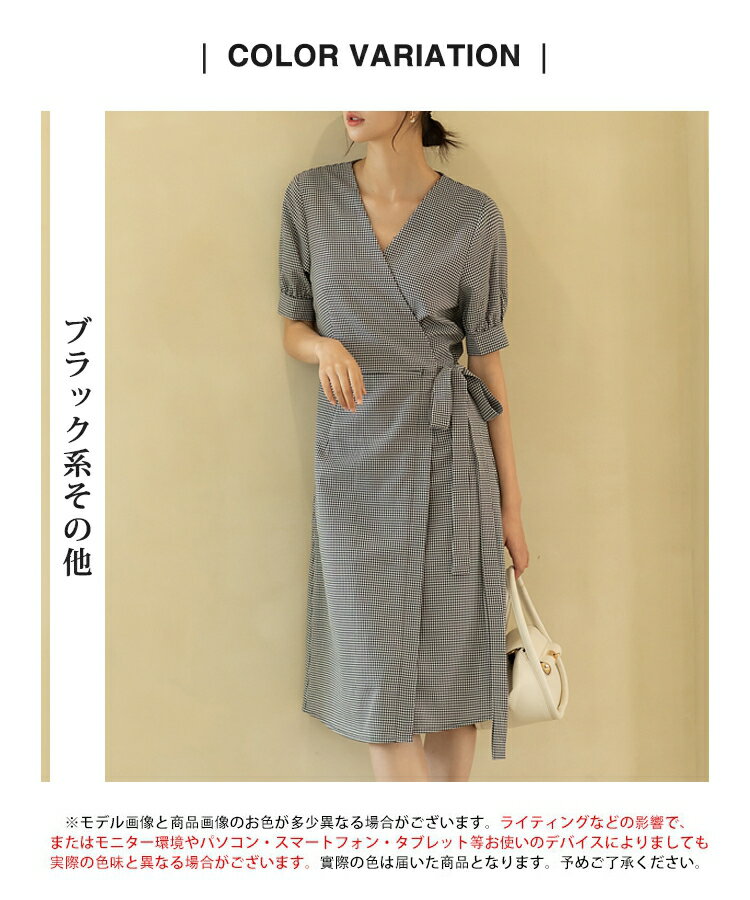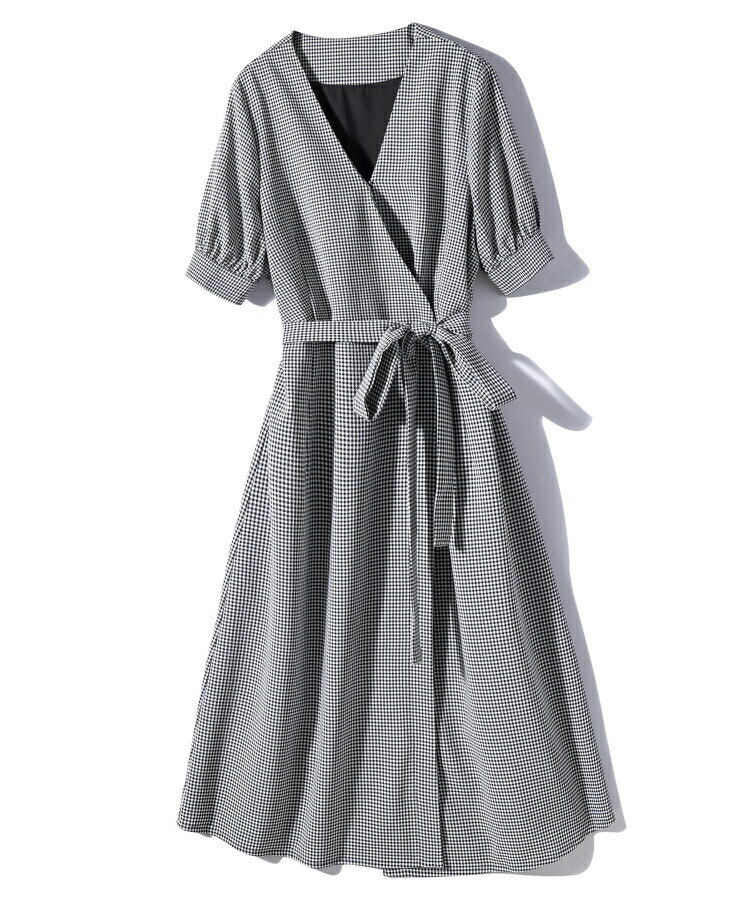 商品について すっきりとしたVネックに、ウエストリボンが可愛らしいギンガムチェックカシュクールラップワンピース。