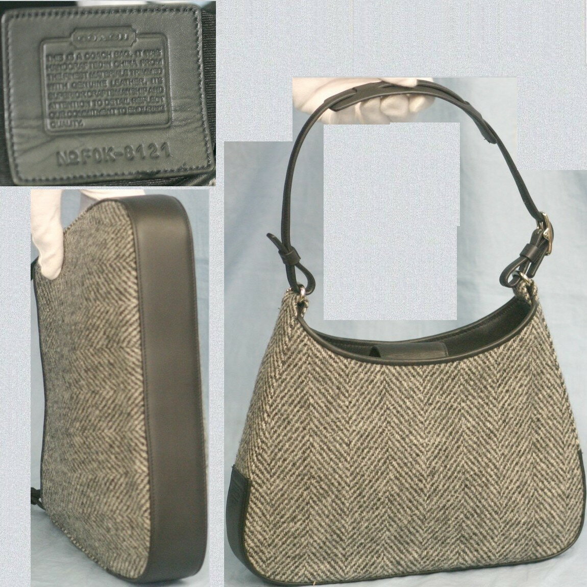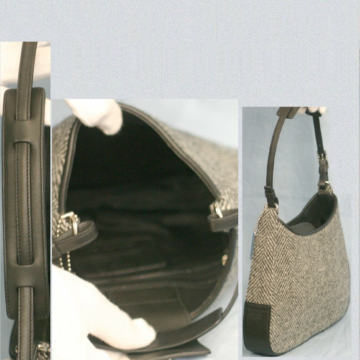 【中古】本物新品同様コーチ黒x白ツイート素材x黒革26cmセミショルダー